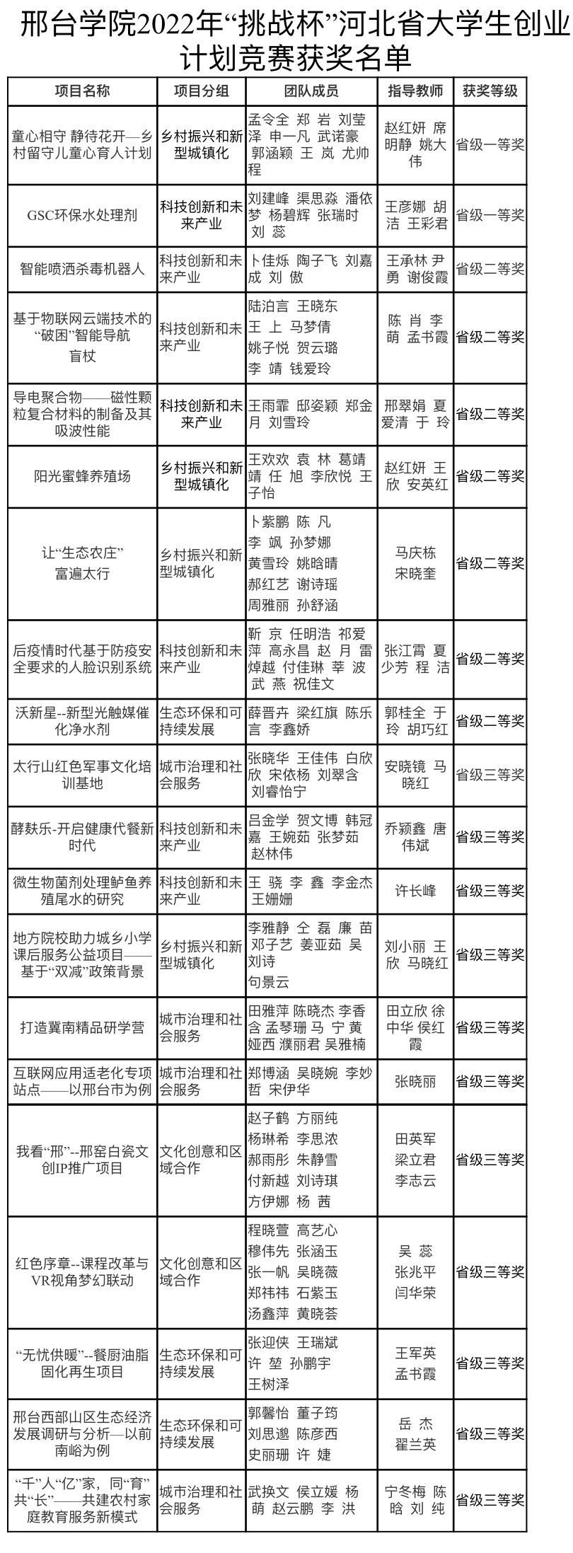 近日,2022年“挑战杯”河北省大学生创业计划竞赛终审决赛在河北工程大学举行。经过省级评审,我校20件项目从全省96所院校上报的1656件作品中脱颖而出,全部获奖,其中荣获省级一等奖2项、二等奖7项、三等奖11项。