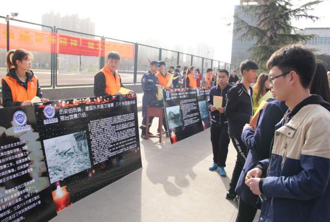 活动现场,我校师生代表全力协助防灾科技学院布置场地,组织我校全体学生学习防灾知识,了解邢台大地震的详细情况。防灾科技学院的学生代表则采用地震历史展板、派发防灾知识宣传单和声文并茂的方式,向我校学生热情的介绍地震次生灾害预防常识、地震避险顺口溜和科普求生技能。同学们认真聆听,针对防灾知识提出自己的疑问,得到了防灾科技学院同学的专业解答。最后,防灾科技学院赠送给我校他们的工作服,双方领导分别签字留念。